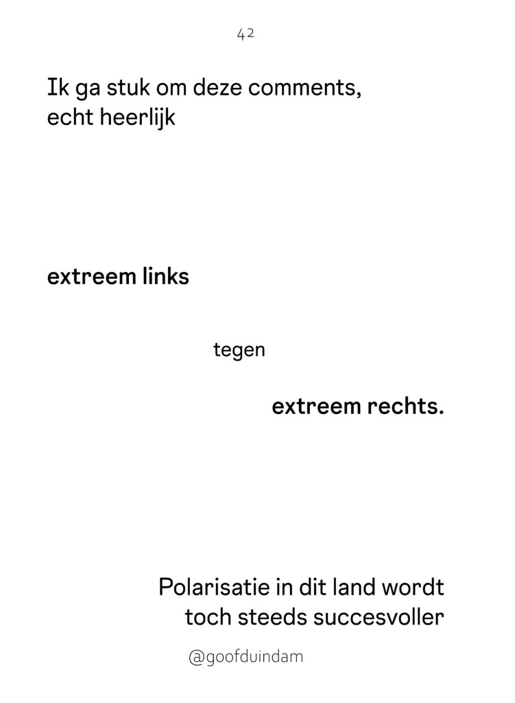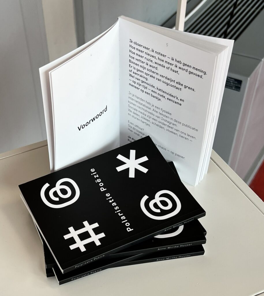 De term polarisatie verwijst naar de ongenuanceerde aard van sociale media, terwijl poëzie de opmerkingen verheft en serieus neemt. In boekvorm kun je niet scrollen: je bladert, leest opnieuw, en komt zo op een andere manier in gesprek.